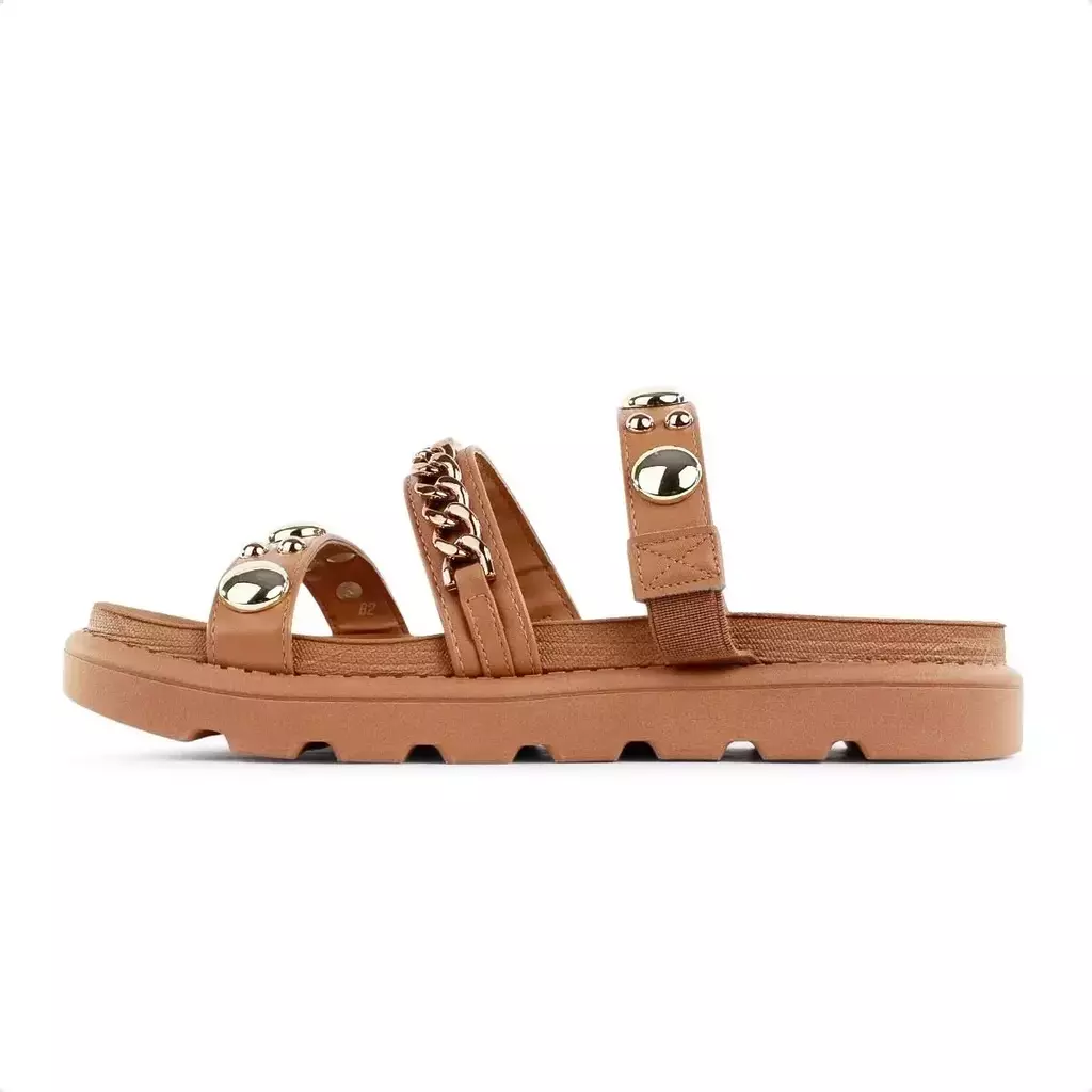 Fabricada en material sintético con detalles metálicos y cadena, ¡esta sandalia es una auténtica bomba! Ideal para componer looks casuales y cómodos.